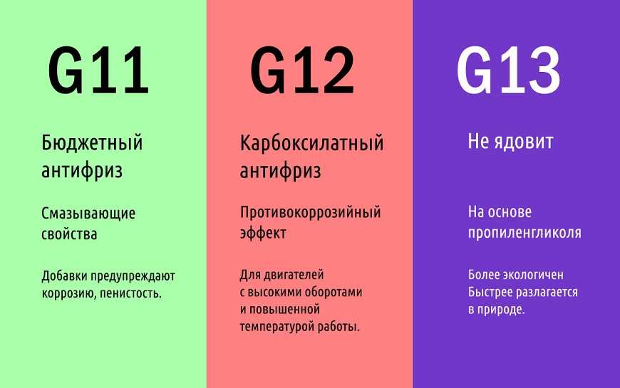 - G13 – относительно новый антифриз. Его основу, вместо этиленгликоля, составляет безвредный пропиленгликоль. Окрашивается в розовые или фиолетовые оттенки.