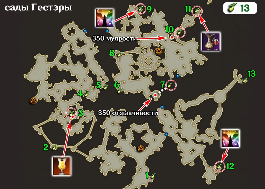 № 10 – Вы сможете войти в секретную область, набрав 350 Мудрости. Вход снизу по карте.