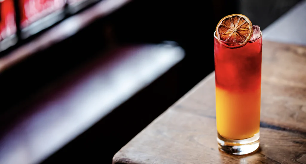 Медленно вливаем сироп «Гренадин», даем ему осесть на дне хайболла, он самый вязкий и тяжелый.
