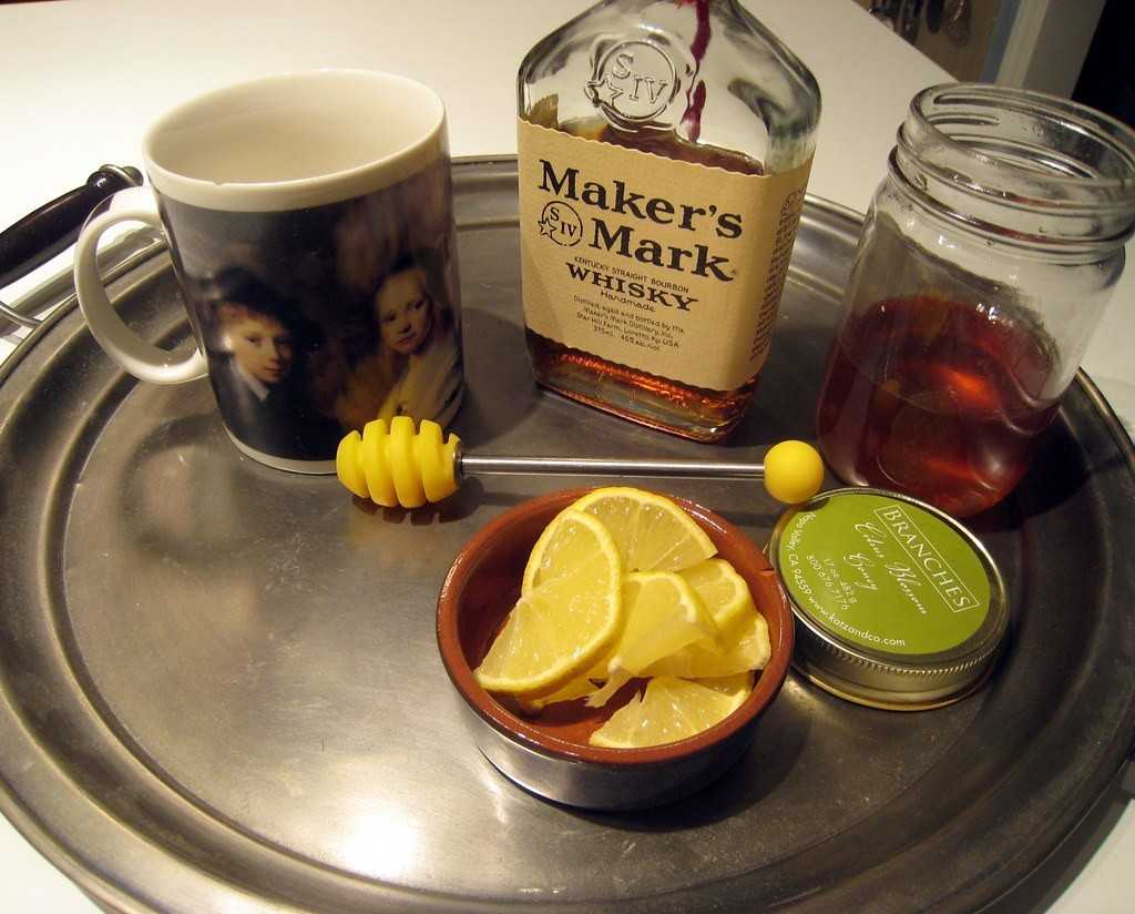 Помести мёд, лимон, чай и виски в большую кружку, налей в неё кипящую воду и хорошенько всё размешай до полного растворения мёда. При желании добавь к коктейлю палочку корицы, она создаст невероятный аромат. Пей напиток горячим.