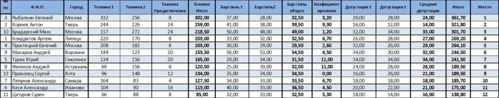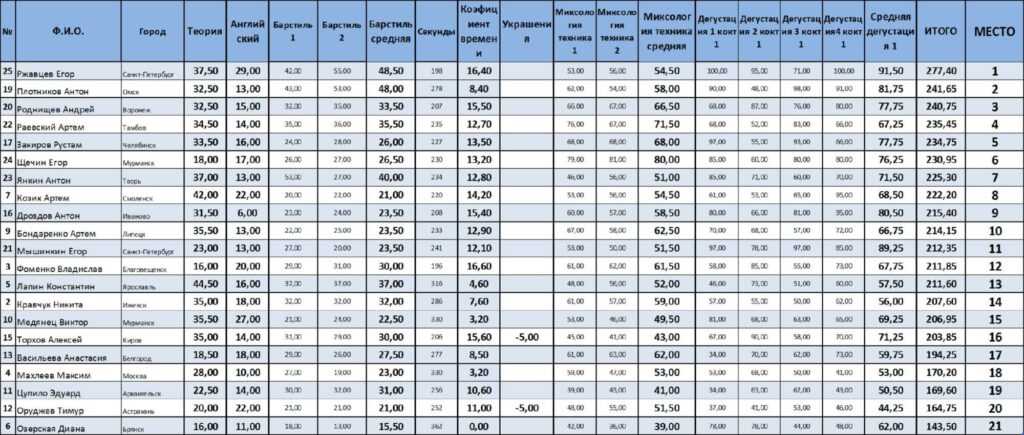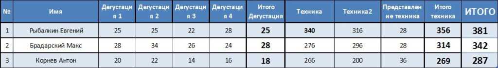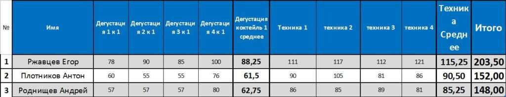Сводная таблица категории Flair Bartending после прохождения участниками номинаций Flair и Bar Style: