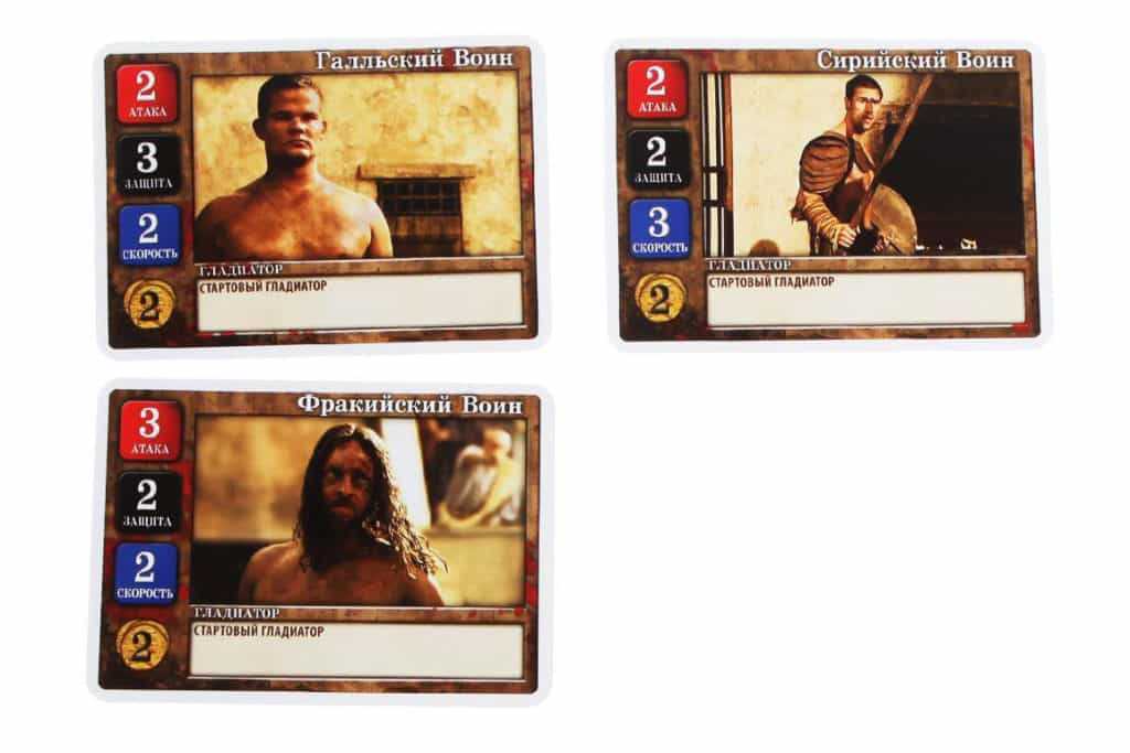 На карточках гладиаторов вы уведите имя выбранного бойца и его характеристики
