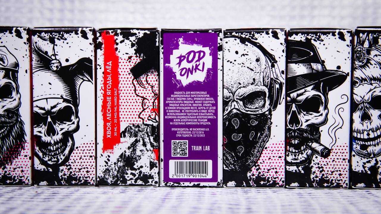 Серия вкусов PODONKI поставляется в глянцевых картонных коробках. Цветовая гамма оформления и изображения на трех гранях зависят от выбранного сочетания. На лицевой стороне расположены названия линейки и вкуса. Левая боковая грань отведена под расшифровку вкуса на русском языке, объем и содержание никотина. Обратная сторона выделена под информационный блок – описание продукта, состав, предупреждения, данные о производителе с датой производства и сроком годности. Ниже – логотип компании, QR-код ведущий на Telegram канал производителя и штрихкод. На верхней крышке дублированы названия линейки и вкуса.