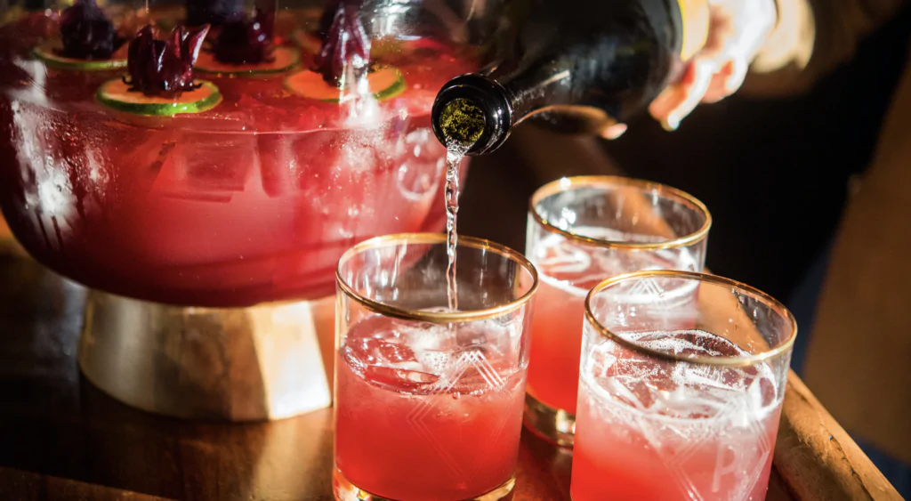 Напитки подаются в тонких высоких бокалах с короткой ножкой, но никто не запрещает в исключительных случаях подавать их в переносных емкостях.