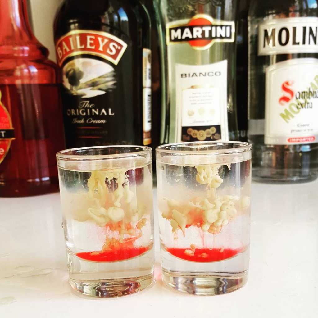 Сначала налейте в стакан белый вермут, а затем аккуратно добавьте ликер Бейли. Третьим ингредиентом будет гранатовый сироп, который придаст коктейлю кровавый оттенок, и только после этого можно поливать самбуку (причем аккуратно).