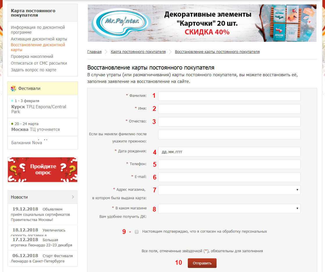 - Заполните анкету: Ф. И. О.; дата рождения; номер телефона; адрес электронной почты; адрес магазина, где выдана карта; адрес, где удобно забрать новую карту.