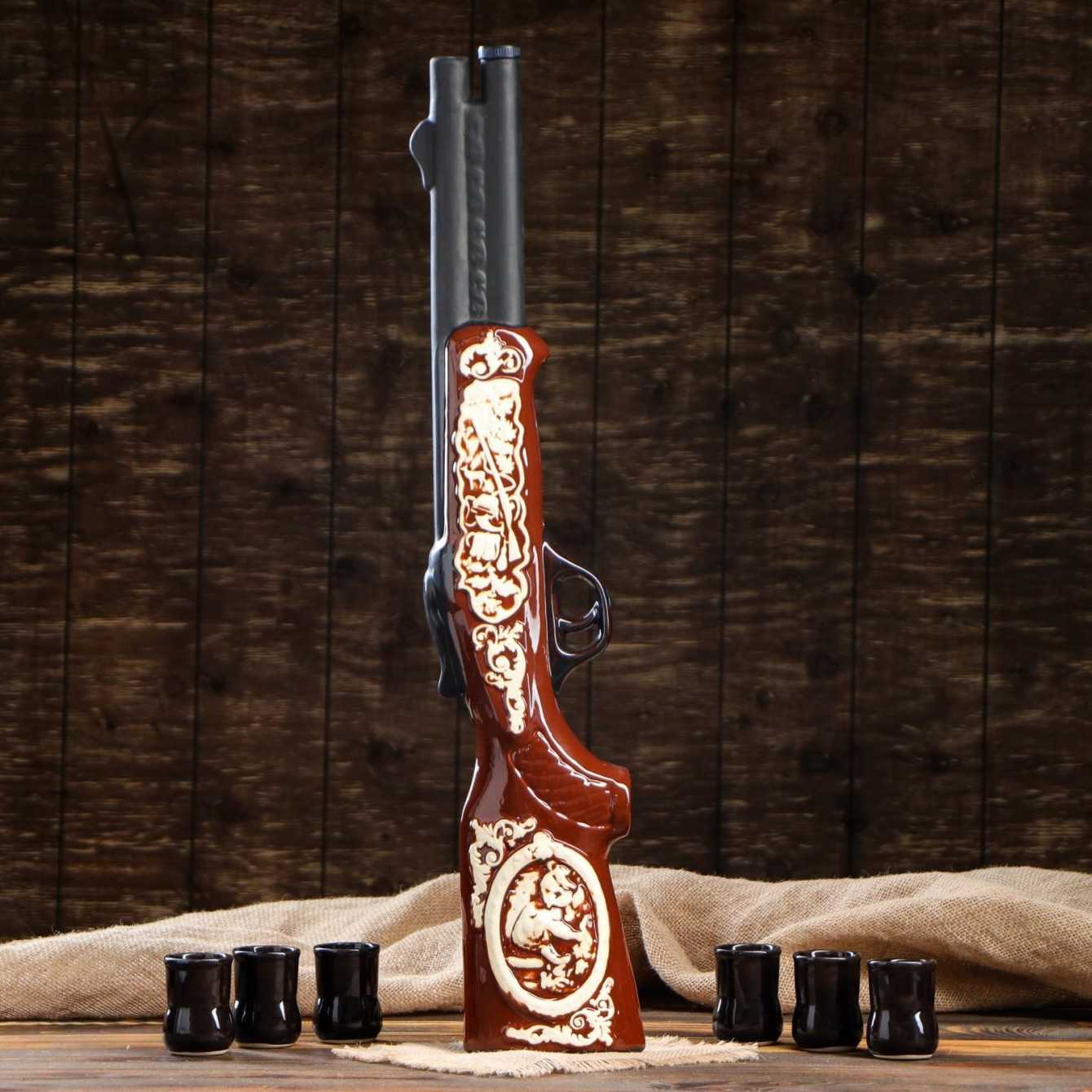 Данное изделие производится на Украине и пользуется довольно большой популярностью из-за своего необычного дизайна. Емкость выполнена в виде двуствольного ружья, на рукояти — орнамент в виде животных, к ней также прилагаются стопки в количестве 6 штук, которые выполнены в форме патронов черного цвета . Подходит такая посуда для подачи крепких спиртных напитков. При создании столь оригинального дизайна используют керамику, сам графин имеет вместительные размеры (1,5 литра), что позволяет использовать его для больших компаний. Материал изделия отличается прочностью и способностью длительное время сохранять температуру налитых напитков, также он полностью безопасен для здоровья человека.