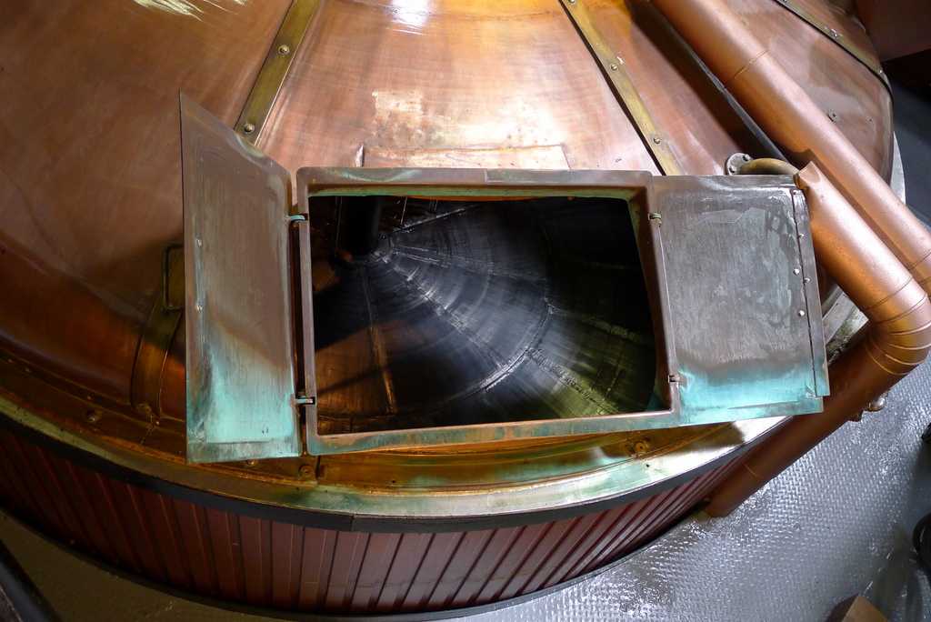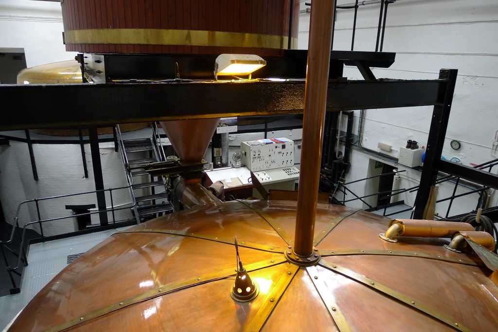 Теперь идет в зал готовки сусла. Большая емкость сверху, туда куда приходит приготовленная мука. Она затем заправлется в чан для сусла — mash tun (внизу), где несколько раз заливается горячей водой — и вода становится всё горячей. Далее на ферментацию, а позже и дистилляцию пойдет только намытая сладковатая жидкость. Твердые остатки зерна будут высушены и использованы как корм скоту.