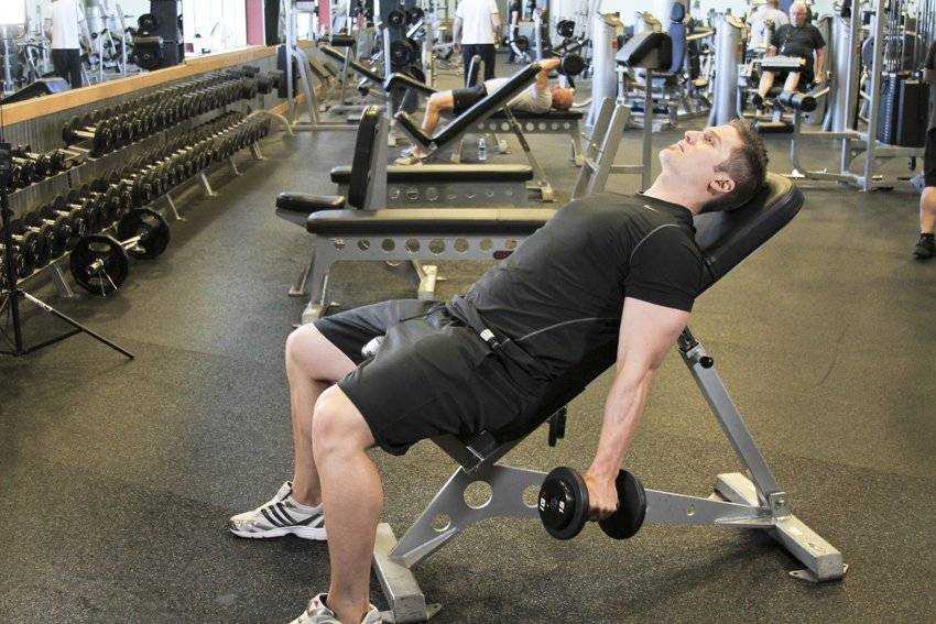 Жим гантелей лежа на скамье с положительным наклоном4 подхода по 12 повторений