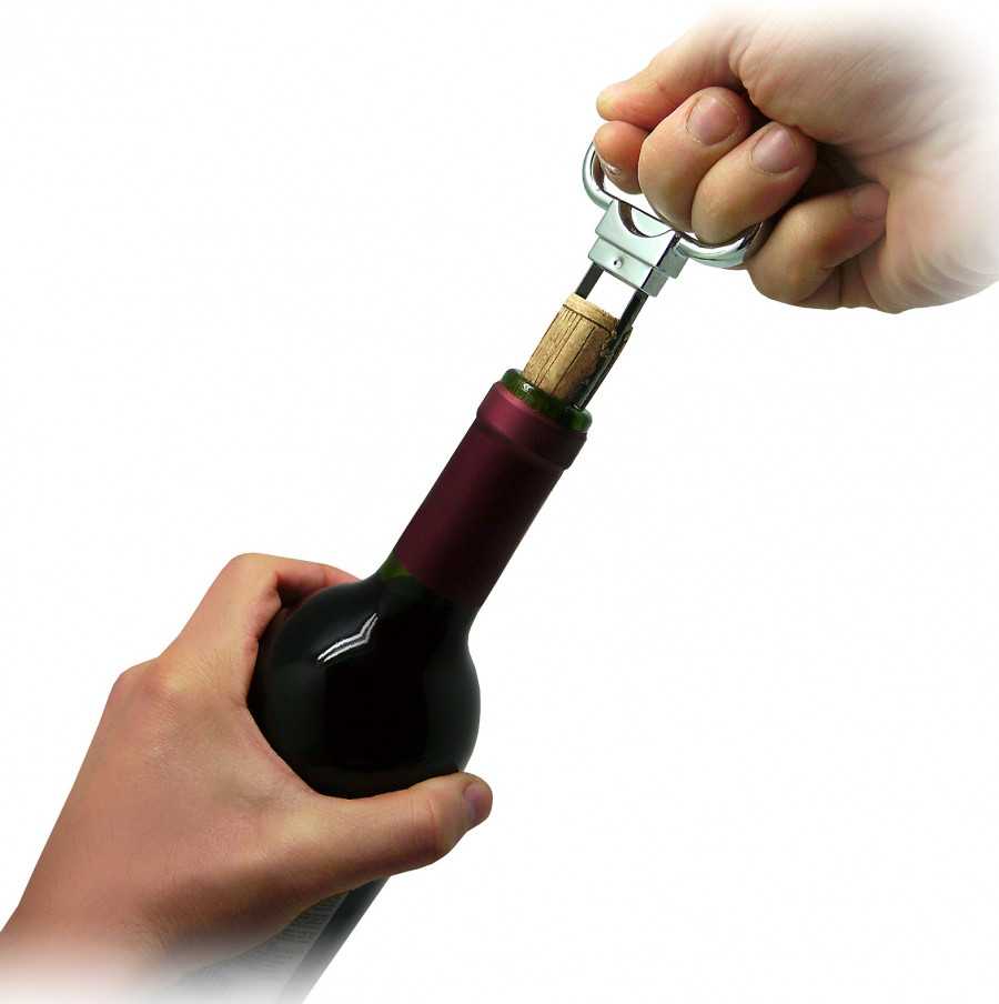 Конструкция напоминает «бабочку», однако процесс немного отличается. Устанавливаем спираль по центру и вкручиваем по часовой стрелке до конца основания пробки. Затем делаем обратные движения и открываем бутылку. Достоинство штопора заключается в легкости применения, поэтому открыть вино без усилий сможет даже хрупкая девушка.