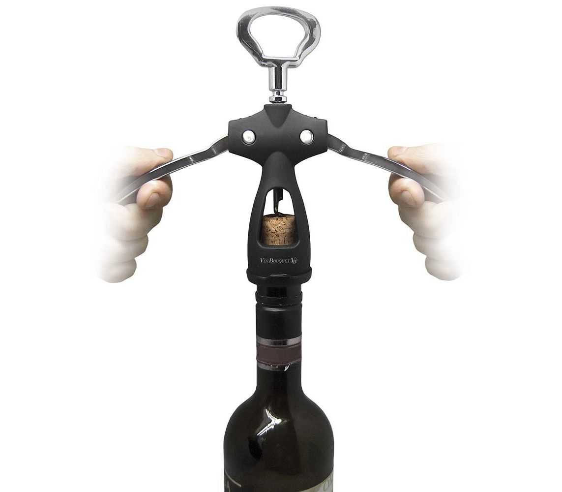 Конструкция напоминает бабочку, расправляющую крылья. По центру расположен винт, а по бокам — два рычага. Чтобы открыть бутылку, одной рукой направляем спираль по центру пробки и надавливаем, второй рукой начинаем закручивать винт до основания. В процессе вкручивания рычаги по бокам начнут подниматься. Когда они достигнут горизонтального положения, ставим ровно бутылку и обеими руками одновременно нажимаем на рычаги.