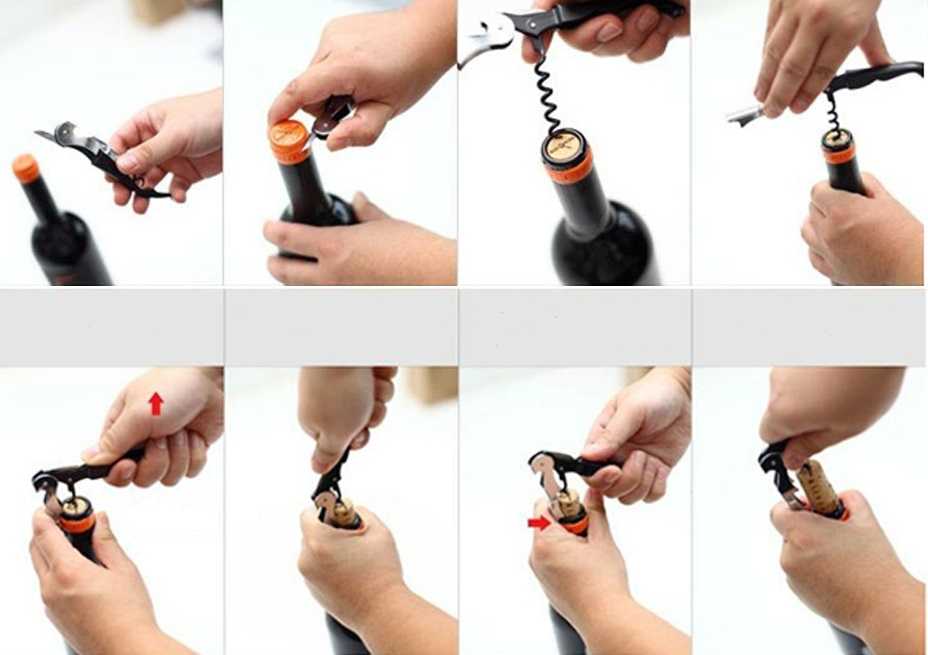 Процесс открытия вина ножом сомелье происходит следующим образом: