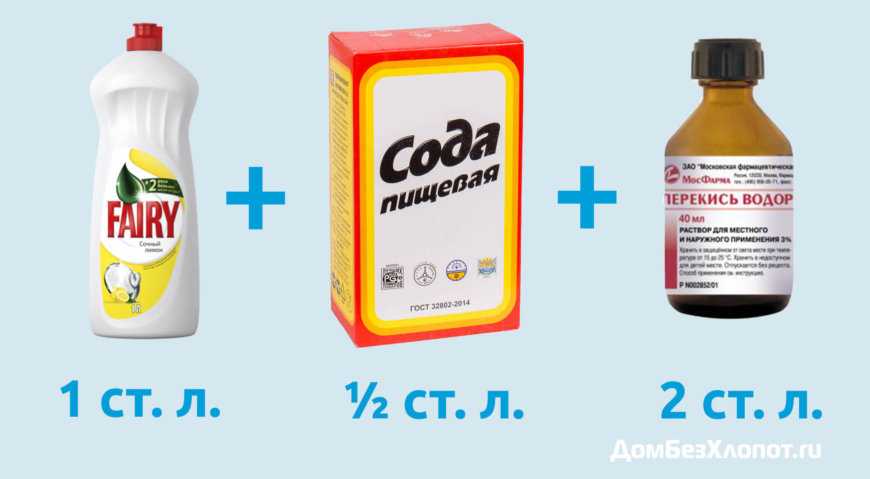 - В небольшой мисочке смешайте 1 ст. ложку средства для мытья посуды, половинку столовой ложки соды и 2 ст. ложки перекиси.