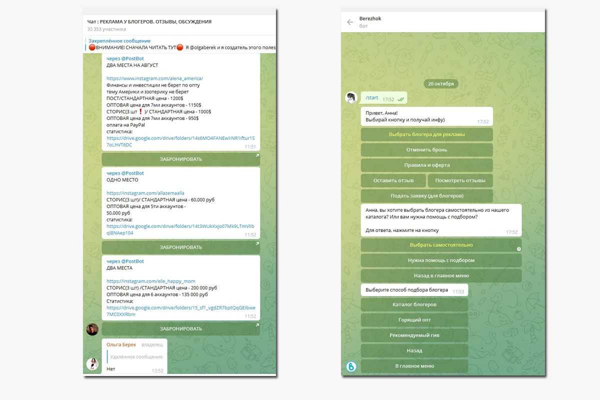 fromBerek в Телеграме, публикуются отзывы о размещениях у блогеров, можно осуществить поиск блогера в Инстаграм* самостоятельно, или девочки сами подберут блогера по оптовой цене и возьмут на себя все согласования
