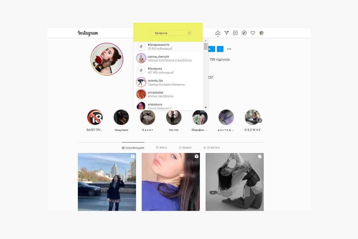 Вы вводите нужное слово в поиск в Инстаграме*, и вам выдаются подходящие аккаунты для рекламы у блогеров. Вводите только то слово, которое будет встречаться в описании профиля. Тут есть хитрость: не вводите тематику, а пишите так, как человек сам себя характеризует. Например, не «балет», а «балерина».