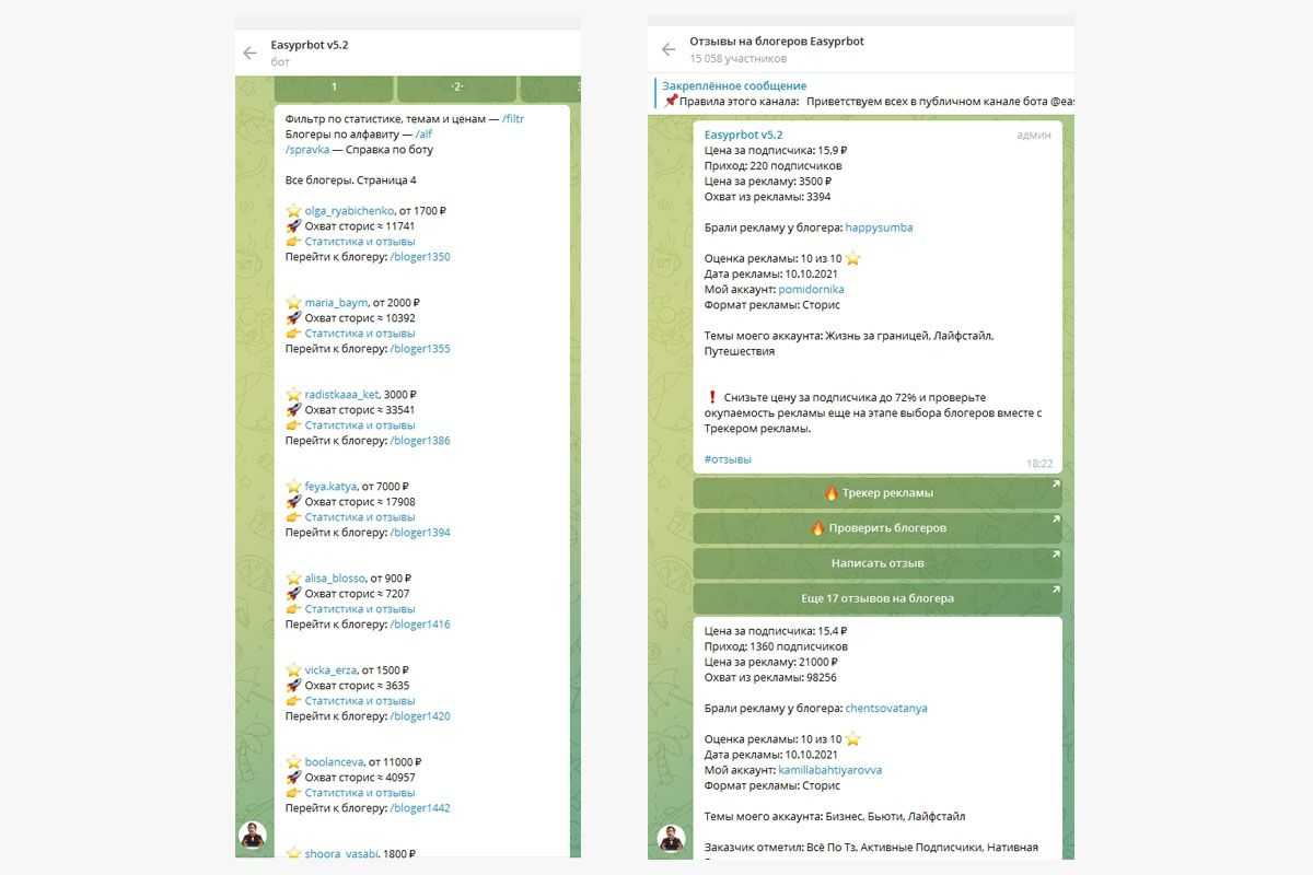 easyprbot имеет 80 блогеров в базе чат-бота, на них можно почитать отзывы в Easyprbot_chat. И еще один известный блог этих ребят – instalogiya_chat
