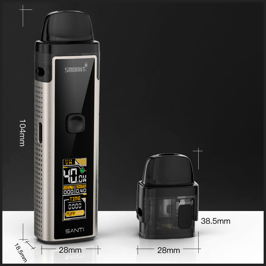 Smoant Santi Pod kit — электронная сигарета со сменными испарителями, которая относится к типу PODMOD-систем. Вобрав в себя всё самое лучшее от старших моделей, устройство обзавелось новыми испарителями более высокого качества и отличным металлическим корпусом, с расположенным на нём дисплеем и кнопками управления.
