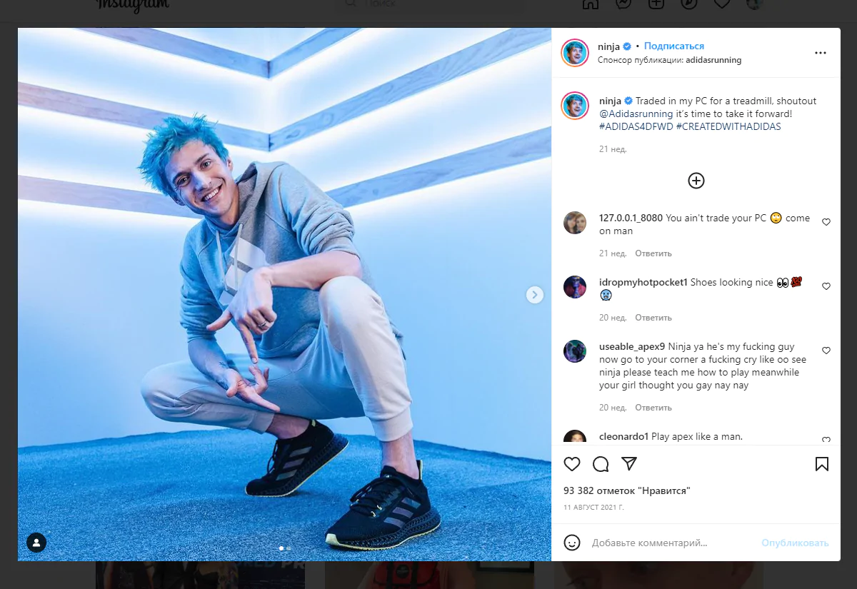 Профессиональный киберспортсмен Тайлер Блевинс, известный как Ninja, стал амбассадором Adidas. Они выпустили совместную коллекцию — на ее создание вдохновили события из жизни стримера, которые также мотивируют молодых людей во всем мире двигаться к своей цели и верить в себя.