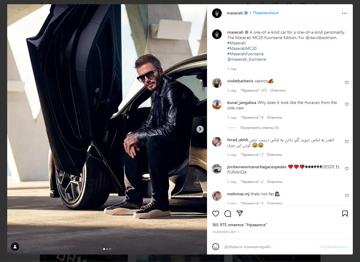 Среди знаменитых певцов, актеров и спортсменов много амбассадоров. Например, Дэвид Бэкхем в разное время представлял различные бренды, а в 2021 году стал амбассадором Maserati — итальянского производителя спорткаров и автомобилей бизнес-класса. Спортсмен разделяет ценности компании и помогает транслировать их на широкую аудиторию. Его образ гармонично вписывается в концепцию бренда эксклюзивных товаров.