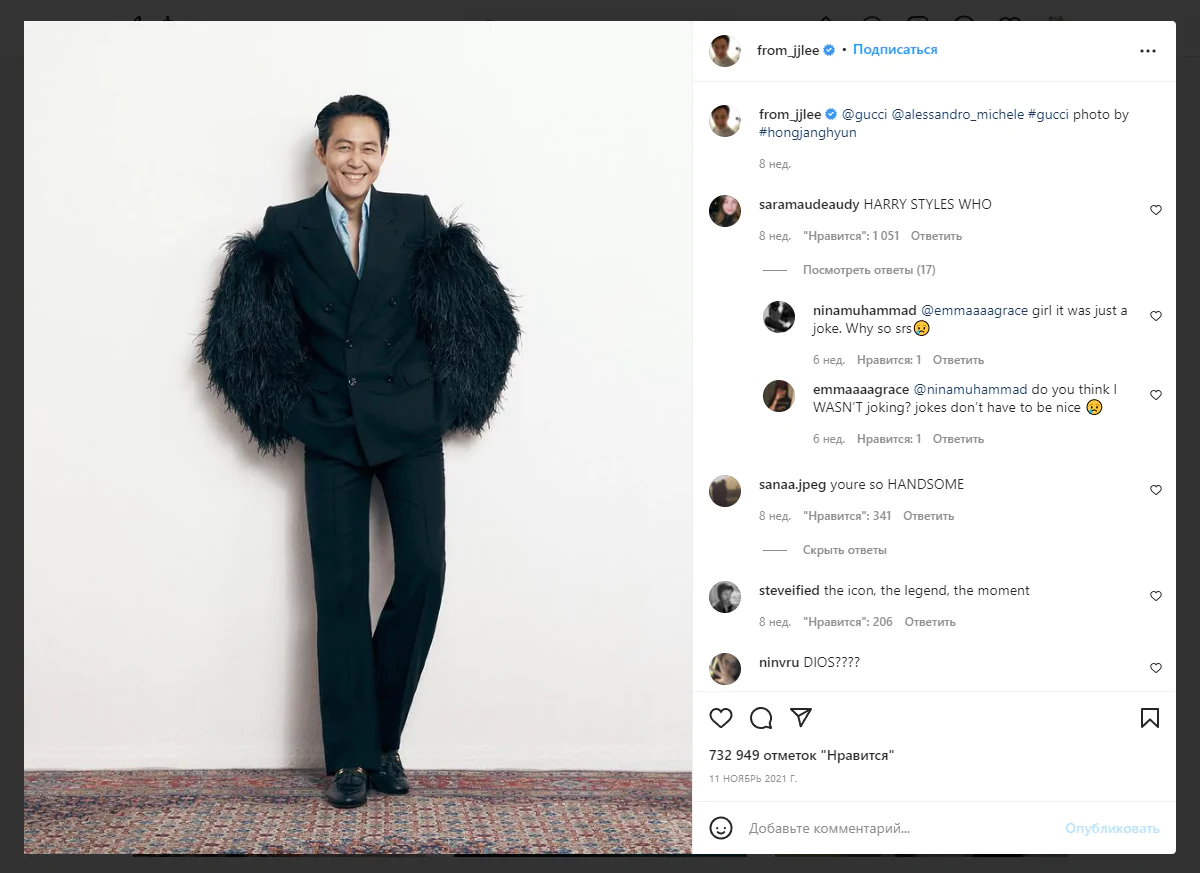 Gucci сделали послом бренда южнокорейского актера Ли Джон Джэ, который снялся в высокорейтинговом сериале «Игра в кальмара». Он начинал карьеру в качестве модели, поэтому кандидатура действительно удачна.