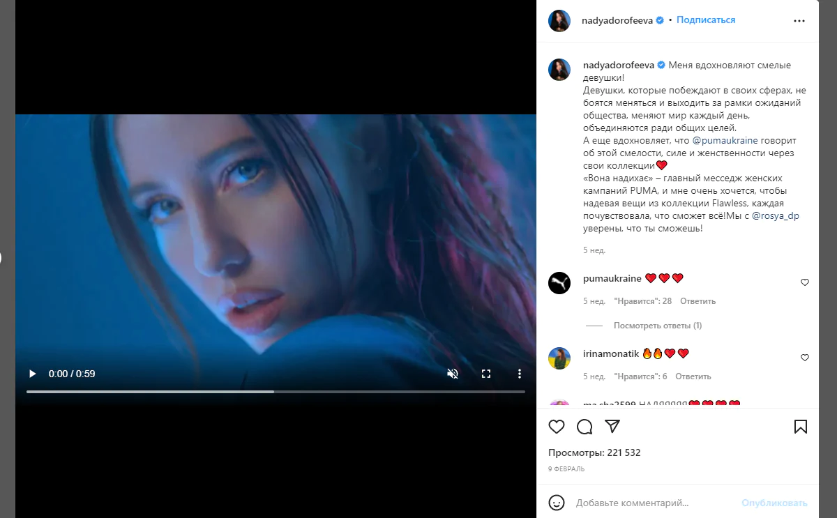 Ролик с Дорофеевой в рамках рекламной кампании Puma