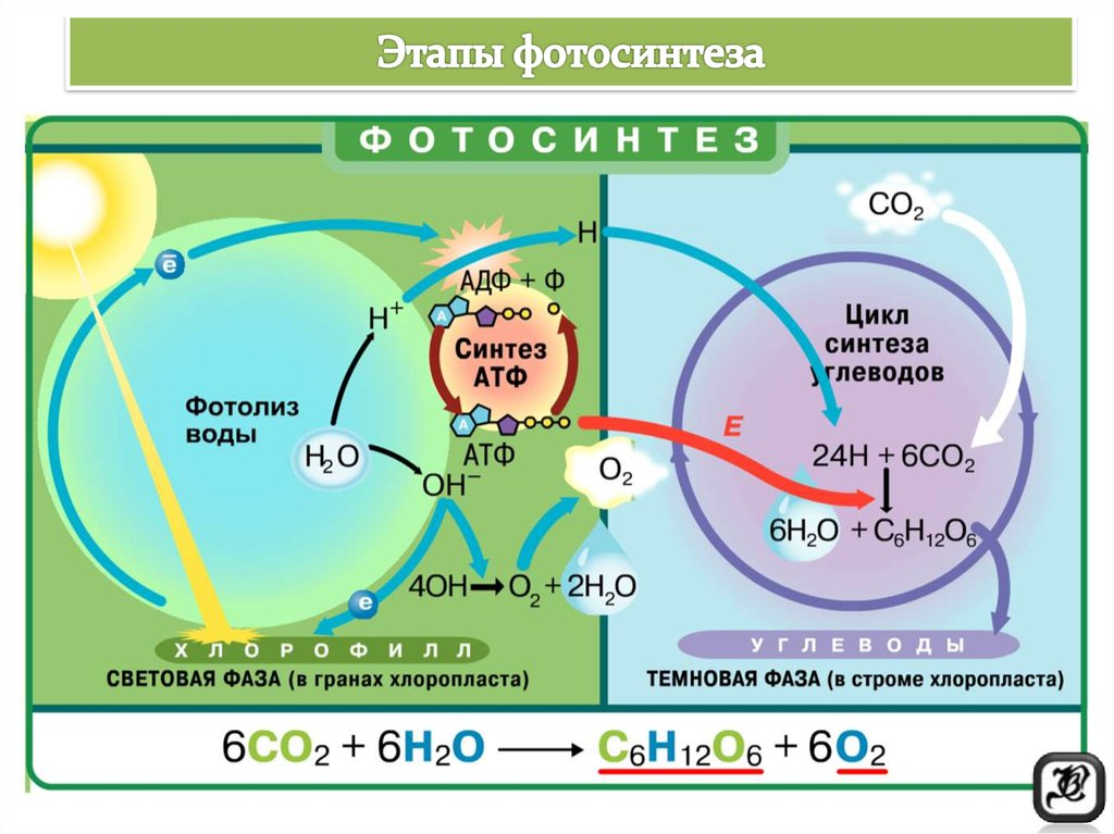 Рис.2. Схема процессов фотосинтеза и суммарное уравнение фотосинтеза.
