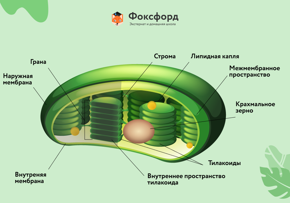 Хлоропласт — это двумембранный органоид. Внешняя мембрана проницаема для большинства органических и неорганических соединений. Она содержит специальные транспортные белки, благодаря которым нужные для работы хлоропласта пептиды и другие вещества попадают в него из цитоплазмы. Внутренняя мембрана обладает избирательной проницаемостью и способна контролировать, какие именно вещества попадут во внутреннее пространство хлоропласта.