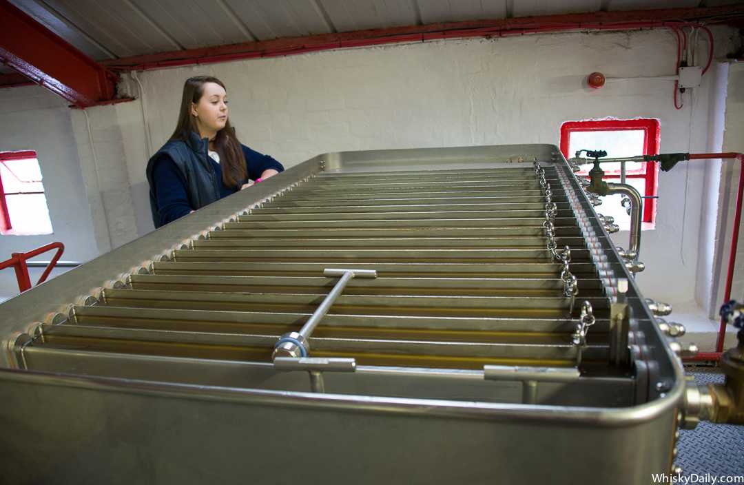 Перед ферментацией сусло должно остыть, иначе дрожжи погибнут. Для этого здесь используется уникальный рефрижиратор Мортона. Он полностью открытый, с ребрами между которыми остывает сусло. Такие повсеместно использовались в 18 и 19-м веке, и были переходным технологией от простых открытых чаной или бассейнов к современным радиаторам.