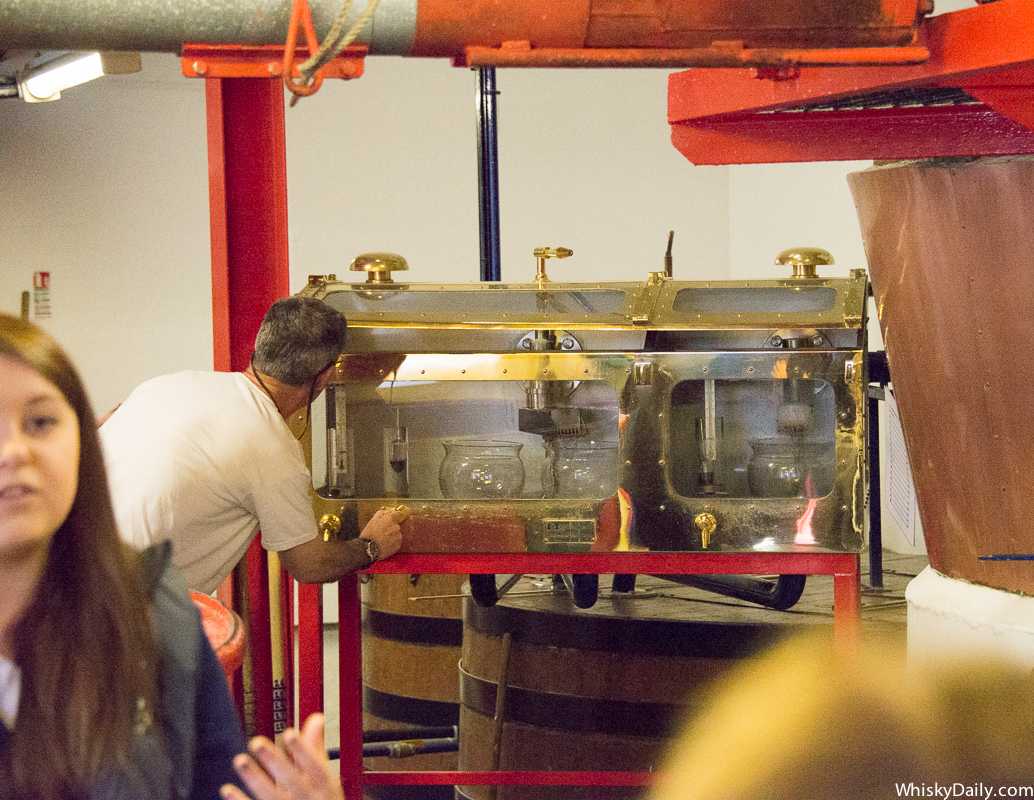 Пока нам что-то рассказывают, дистиллер пользуется спиртовым сейфом — ручкой направляет немного текущего из куба спирта в ареометр.