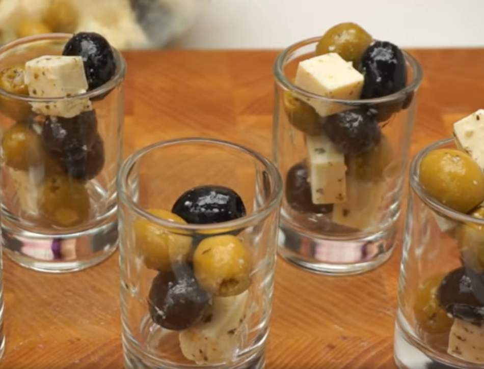 Оливки с сыром подаются в маленьких стаканчиках. Выглядит очень оригинально и красиво. Это одна из самых быстрых и простых новогодних закусок. Автор рецепта – ютуб-канал «Готовим дома».