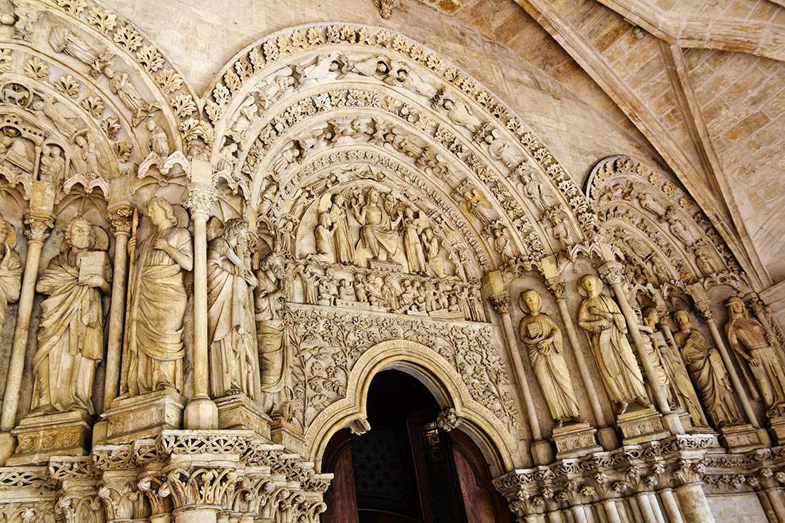 Фасад собора Сен-Андре, выходящий на площадь Пия Берлана, впечатляет стрельчатыми арками с каменной резьбой, узкими окнами-витражами и ажурными розетками над входами. Не менее красив и северный фасад с двумя 81-метровыми колокольнями и Королевским порталом середины XIII в.Он украшен скульптурами библейских персонажей, а его фрески изображают Страшный суд.
