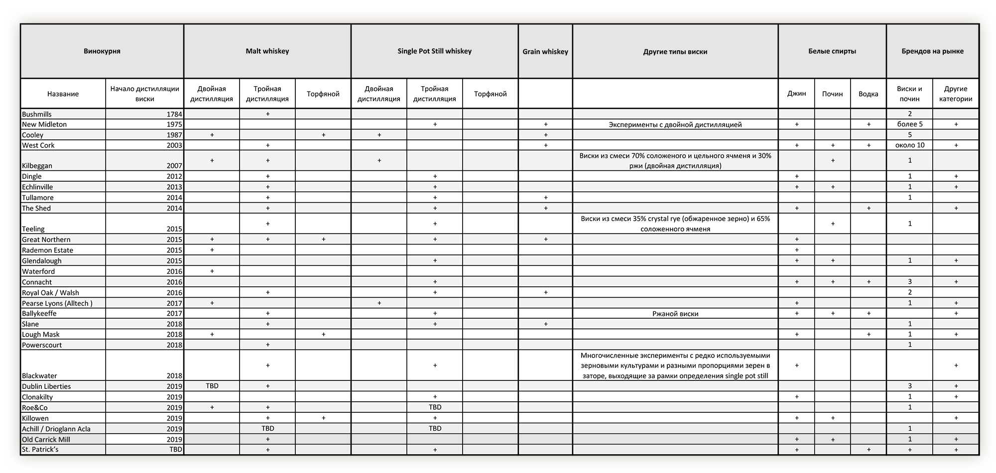 Взгляните на таблицу. В ней я постарался указать все типы спиртов, которые производятся или вот-вот будут производиться уже действующими винокурнями. Не покупных, а собственных. То есть то самое будущее ирландского винокурения.