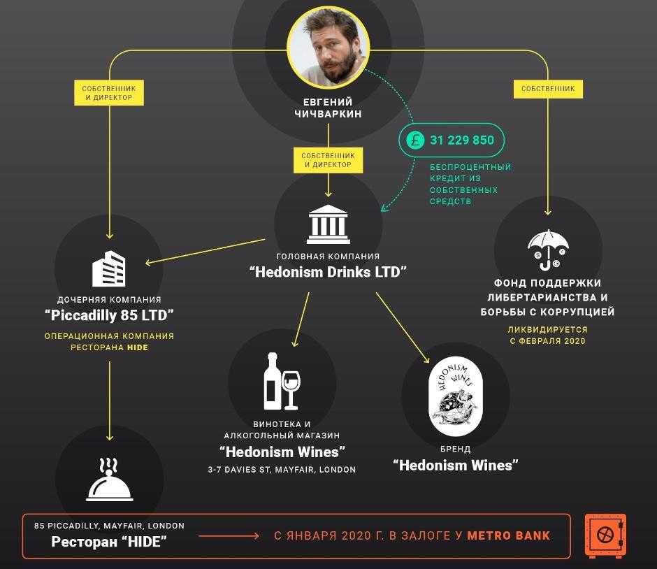 Вторая крупная инвестиция – элитный лондонский ресторан «Hide», – несмотря на респектабельность, пока остаётся убыточным. Однако совокупная прибыль ресторана и винного бутика «Hedonism wine» приносит своему хозяину миллионы фунтов стерлингов. В перспективе Чичваркин рассчитывает окупить и ресторан, но здесь многое зависит от ситуации с пандемией коронавируса.