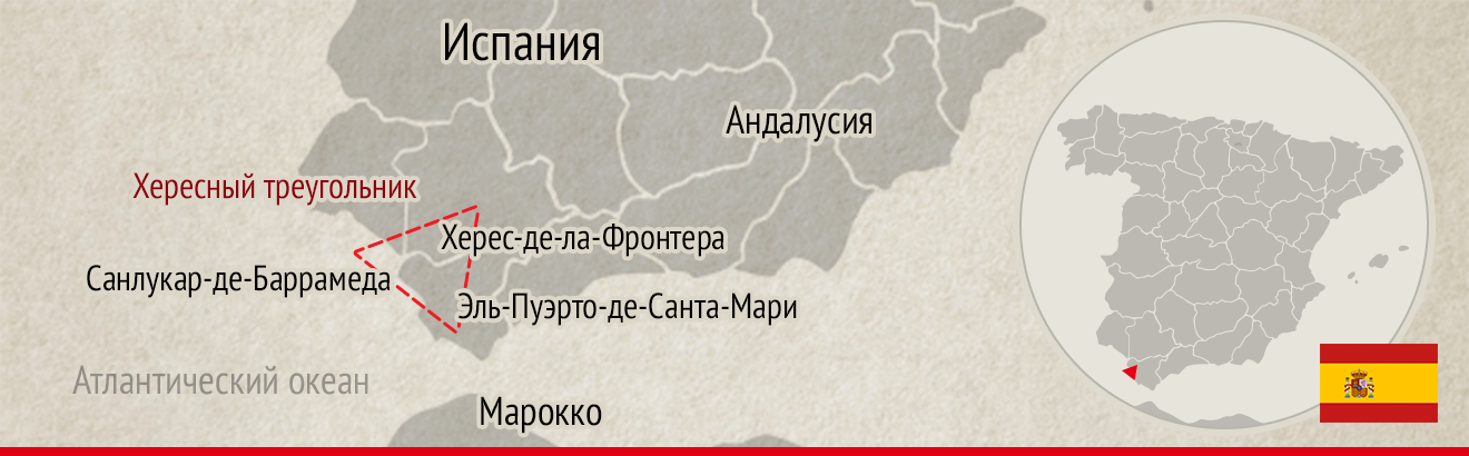 Настоящий херес производят только в «золотом хересном треугольнике» на самом юге Испании — между городами (сейчас будут титры мексиканского сериала) Херес-де-ла-Фронтера, Санлукар-де-Баррамеда и Эль-Пуэрто-де-Санта-Мария.