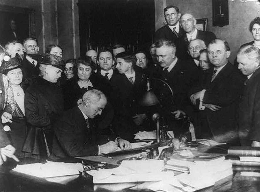 Губернатор штата Индиана Джеймс П. Гудрич в окружении известных «сухих» рабочих подписывает общегосударственный законопроект о запрете на алкоголь, вступивший в силу 2 апреля 1918 года