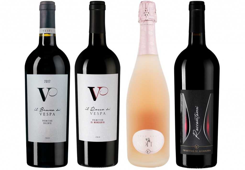 Слева направо: Il Bruno dei Vespa Puglia IGP; Il Rosso dei Vespa Primitivo di Manduria DOC; Vespa Noitre Rosé Brut Noitre Salice; Raccontami Primitivo di Manduria DOC 2016