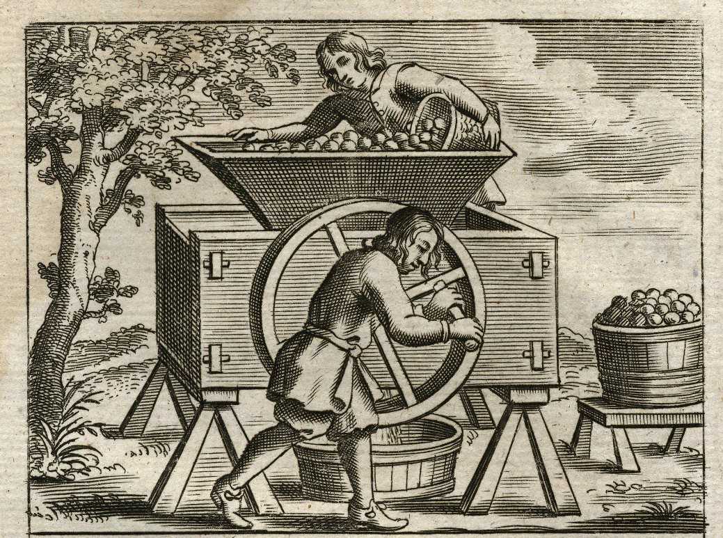 Для отжима сока раньше использовали специальную дробилку с конной тягой и пресс для сидра. Пресс представлял собой огромный чан для слива жидкости, специальную коробочку для фруктов и утяжелители. Подобную конструкцию можно сделать самостоятельно из подручных материалов.
