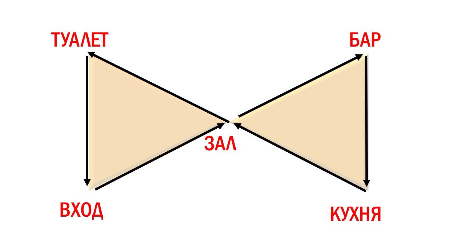 Так называется траектория движения менеджера по ресторану. Начинается она от входа (проверкой всего что там происходит и помощью хостесс), а затем проходит по всем основным зонам ресторана. Траектория «Восьмёрки» зависит от размещения зон ресторана. Единственно что принципиально, чтобы зона «Зал» была в центре, то есть менеджер в зале должен быть в 2 раза чаще чем в любой другой зоне. В нашем примере она выглядит вот так:
