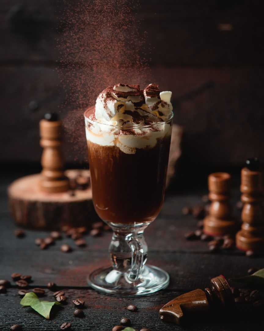 Также вкус отлично гармонирует с апельсином, малиной, карамелью, кокосом, ореховой пастой, мятой. Украсить напиток можно взбитыми жирными сливками.