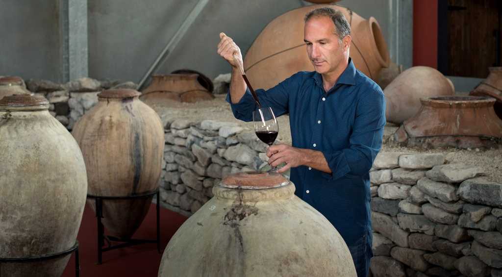 Если повреждения небольшие, карас можно отреставрировать. «Чтобы проверить целостность караса, мы наливаем туда воду и наблюдаем за изменением уровня жидкости в течение десяти дней», – говорит Артем. Помимо общего состояния караса, большое значение имеют толщина стенок и пористость глины, так как от этого будет зависеть степень оксидации во время ферментации. Большие карасы чаще всего не обрабатывают воском, чтобы вино контактировало с голой глиной. Артем говорит, что таким образом вино получает минеральность и особые нюансы в ароматике – земляные и деревенские тона. Виноделы активно экспериментируют с карасами и пытаются найти наиболее подходящее для них место в погребе. Ферментационные карасы можно увидеть на подставках-треножниках. Таким образом удается добиться микрооксидации, так необходимой, например, красным сортам вроде арени или ахтанака. Иногда виноделы закапывают сосуды в землю, но это скорее вариант для выдержки. Распространены и частично закопанные карасы – так, например, использует их Зорик Гарибян.