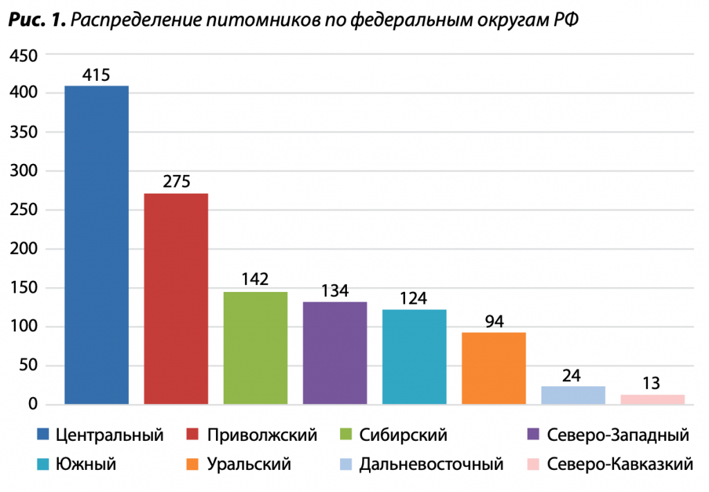 Сегодня перед российским агропромышленным комплексом стоит важная задача возрождения питомниководства, однако многие эксперты считают, что данный вопрос не удастся быстро решить. Одна из проблем в этой области заключается в недостаточном количестве питомников. Так, в 1990 году в Российской Федерации насчитывалось около 500 подобных организаций, среди которых 213 фирм находились под ведомством Министерства сельского хозяйства РФ, 35 компаний — вузов и научно-исследовательских центров, 148 предприятий — лесного департамента. В результате распада СССР данная система разрушилась, как и многие другие отрасли. По сведениям аграрного ведомства, сегодня производством посадочного материала в стране занимаются более 200 организаций — научно-исследовательские институты, сельскохозяйственные компании, крестьянские, или фермерские, хозяйства и прочие, выпускающие широкий ассортимент культур.