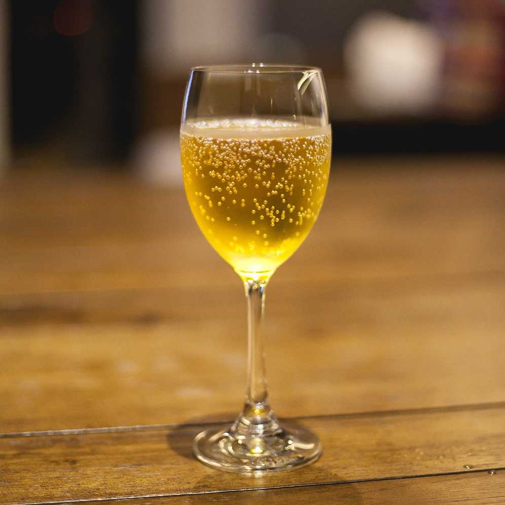 Вино имеет золотистый цвет со средними пузырьками.