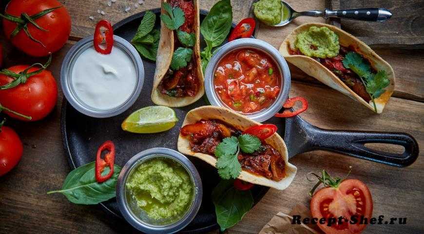 Для приготовления потребуется: • лепёшки – 3 шт. • 50г говядины • 50г красного болгарского перца • 50г желтого болгарского перца • 3г кинзы • 1- 2 капли табаско • 5г сахара • 20 мл растительного масла • 50г красного лука • ½ шт лайма • 40 мл гуакомоле • 40г сметаны • 40 мл томатной сальсы • паприка • соль Зачистите и нарежьте соломкой говяжью вырезку. Красную луковицу и красный болгарский перец нарежьте соломкой. На заранее разогретой сковородке обжарьте приготовленную говядину, овощи, добавьте паприку, чайную ложку cахара, щепотку cоли, соус табаско, черный перец, а также томатный соус. Лепешки сформируйте в форме «лодочки» и поджарьте в саламандре. Приготовленную смесь выложите в лепешки, украсьте кинзой, небольшой долькой лайма и также дополнительно подайте сметану, гуакомоле и томатную сальсу.