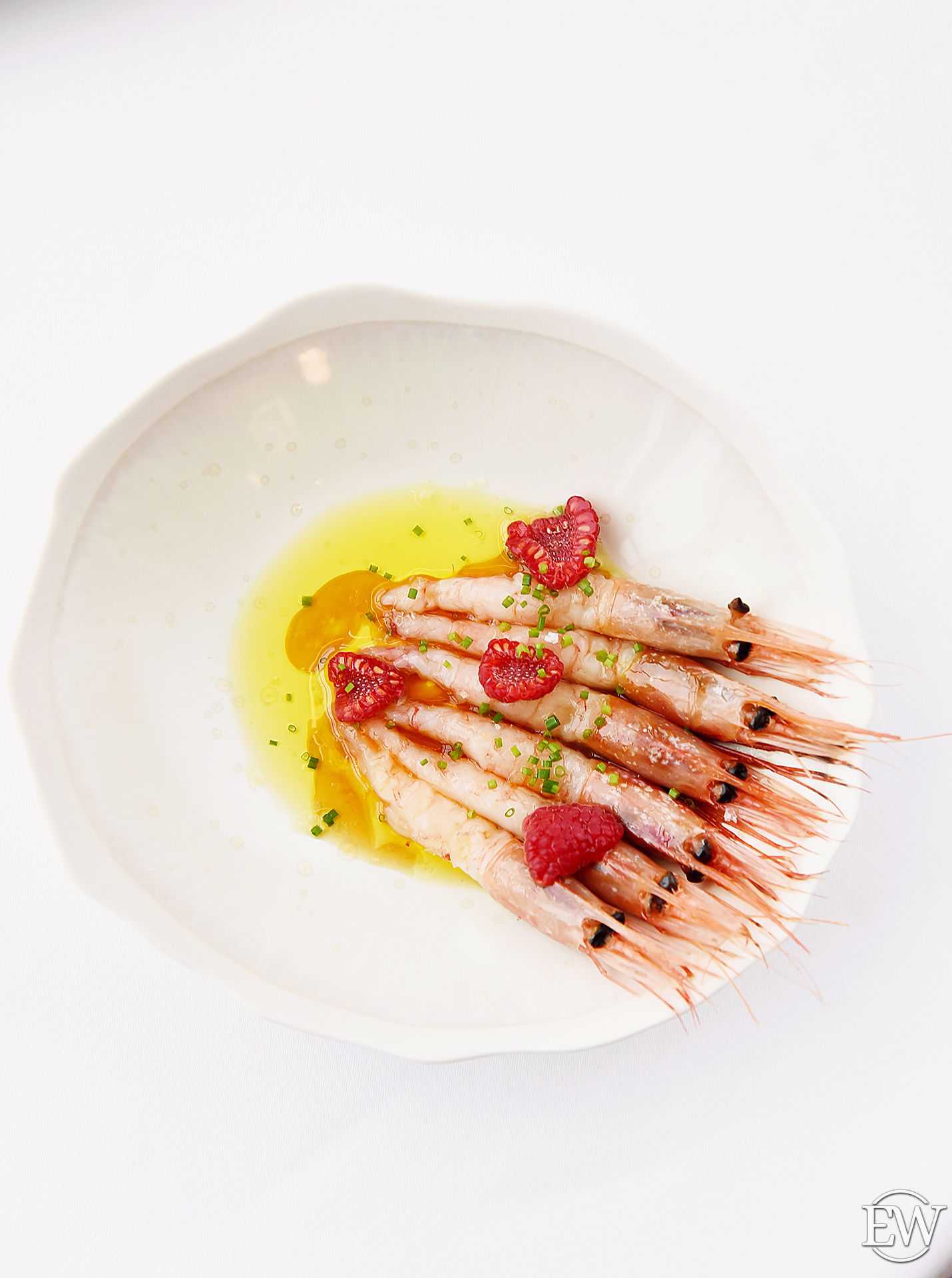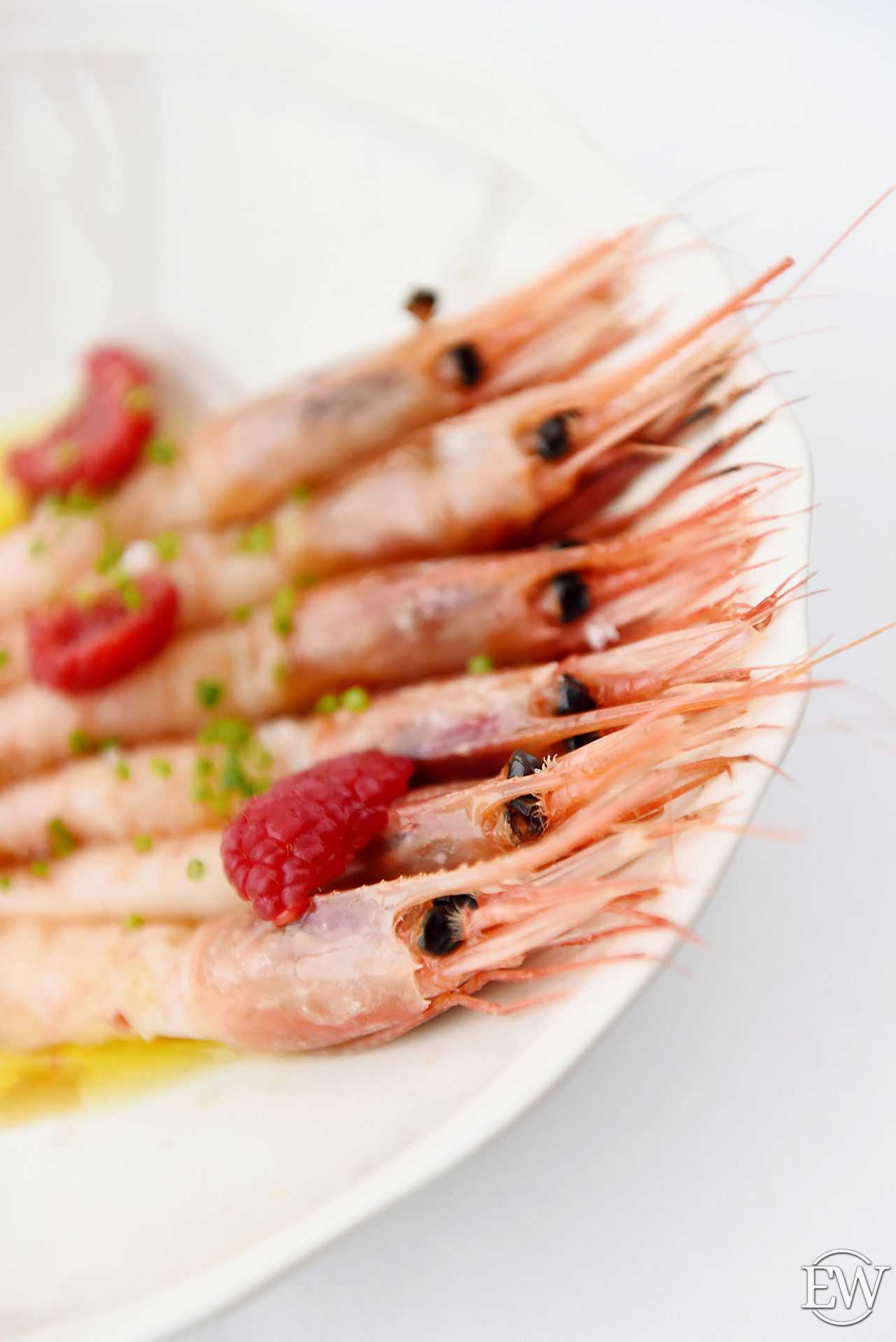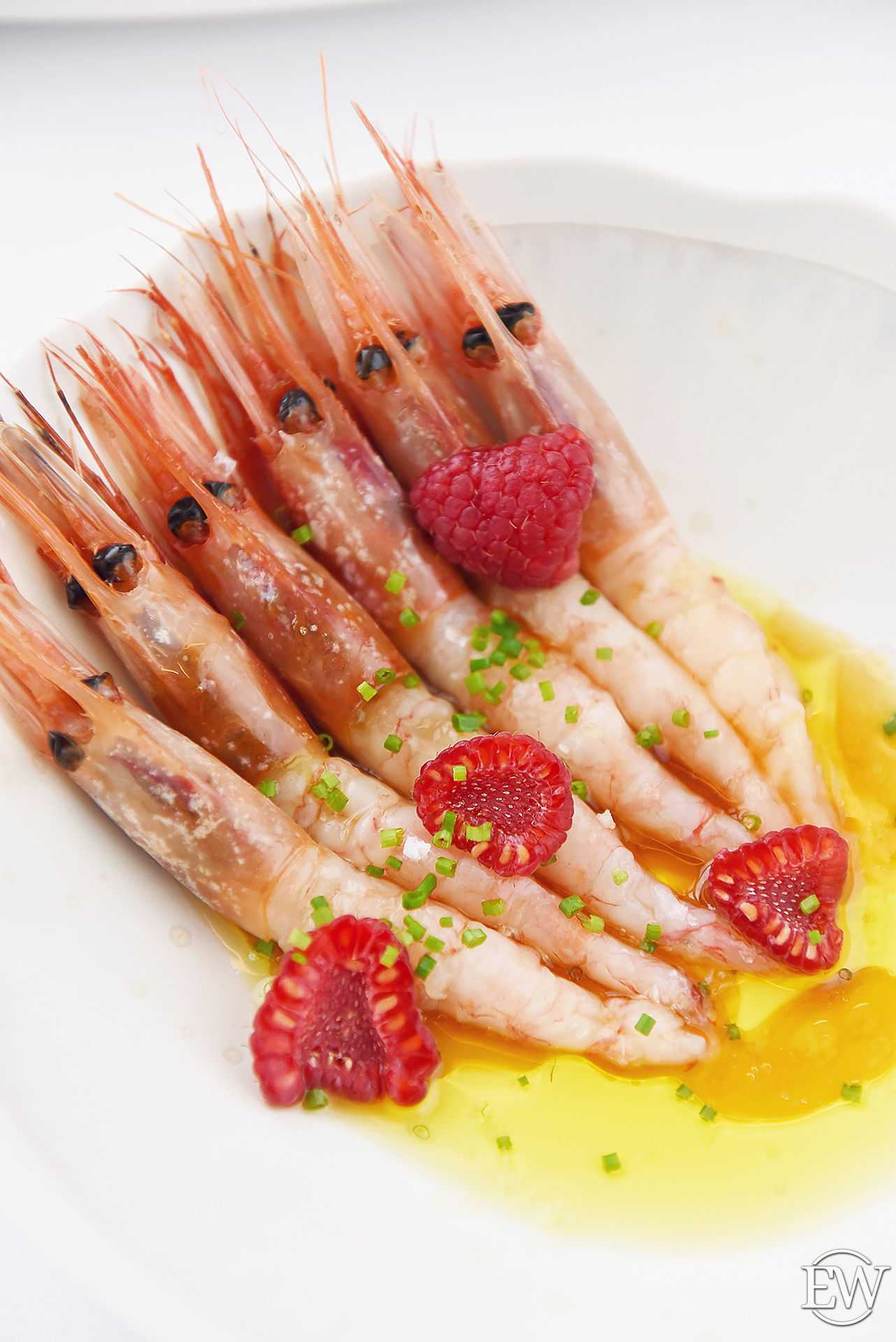 Сладкая креветка с малиной и соусом лимонный понзу (690 р.) — освежающая закуска из свежего мяса креветки с легким ягодным напоминанием о лете, которая прекрасно подготовит ваши рецепторы к дальнейшим изыскам.