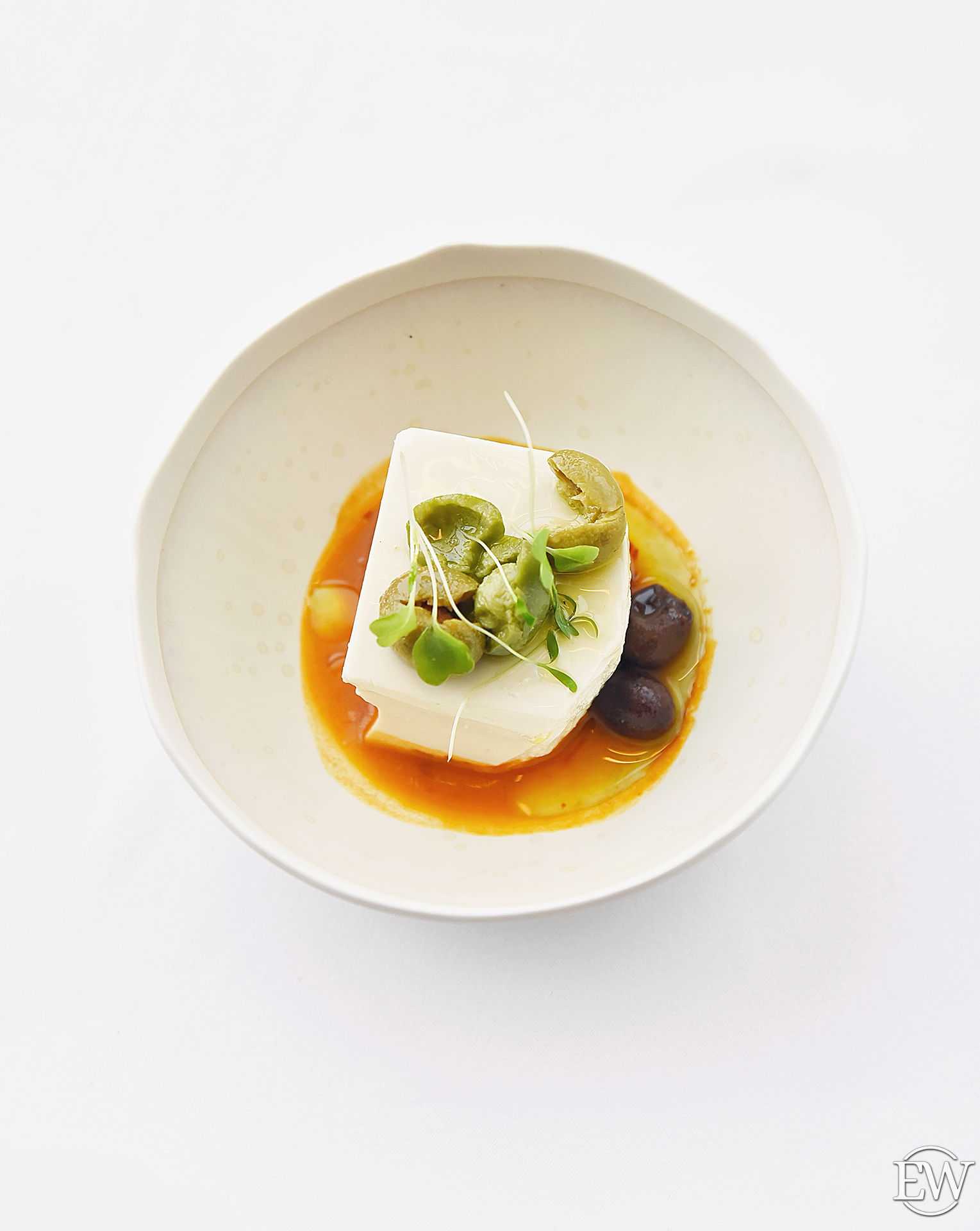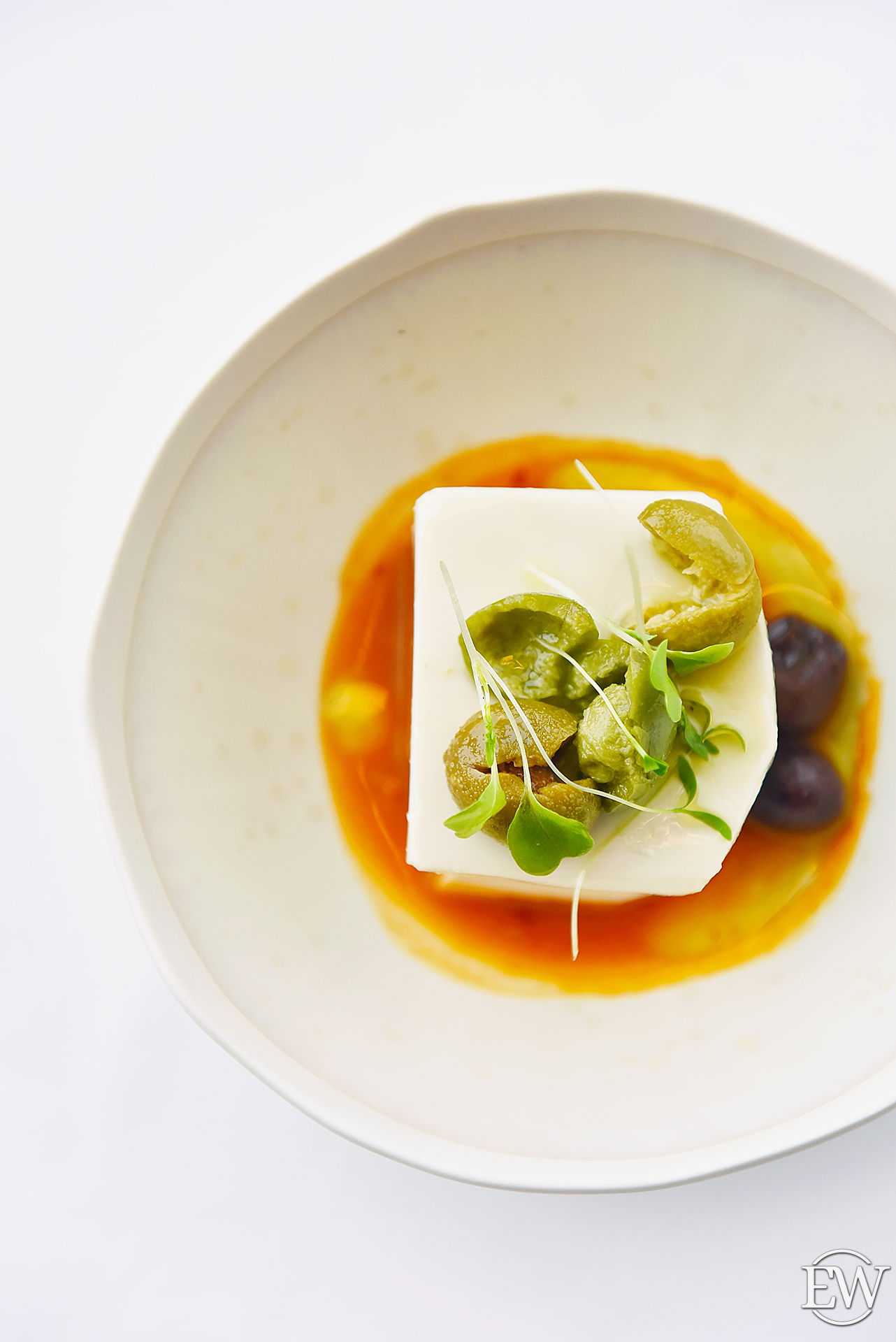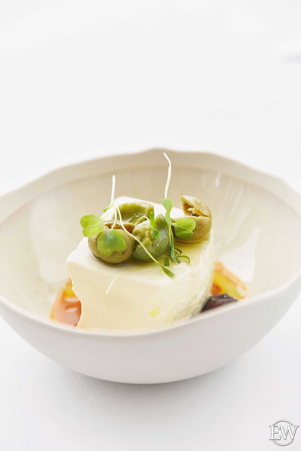 Свежий тофу с таджасcкими оливками и оливковым маслом (450 р.) — в «Сахалине» любимый японцами и веганами сыр варят самостоятельно. Чистый оригинальный вкус и шелковая текстура, которую ярко дополняют средиземноморские деликатесы.