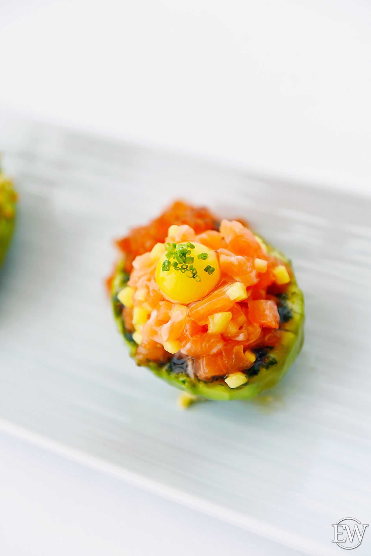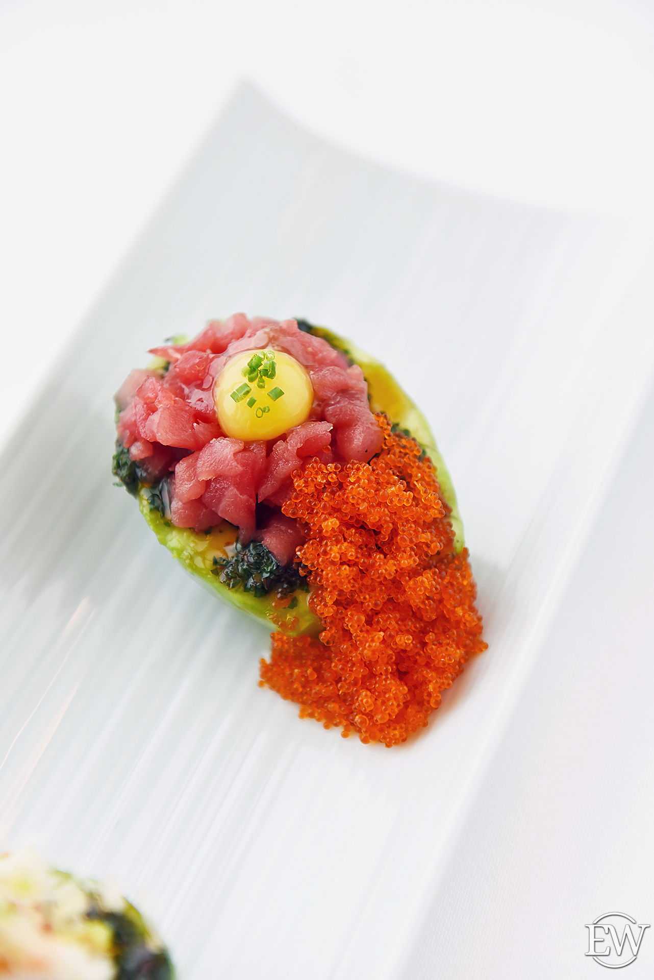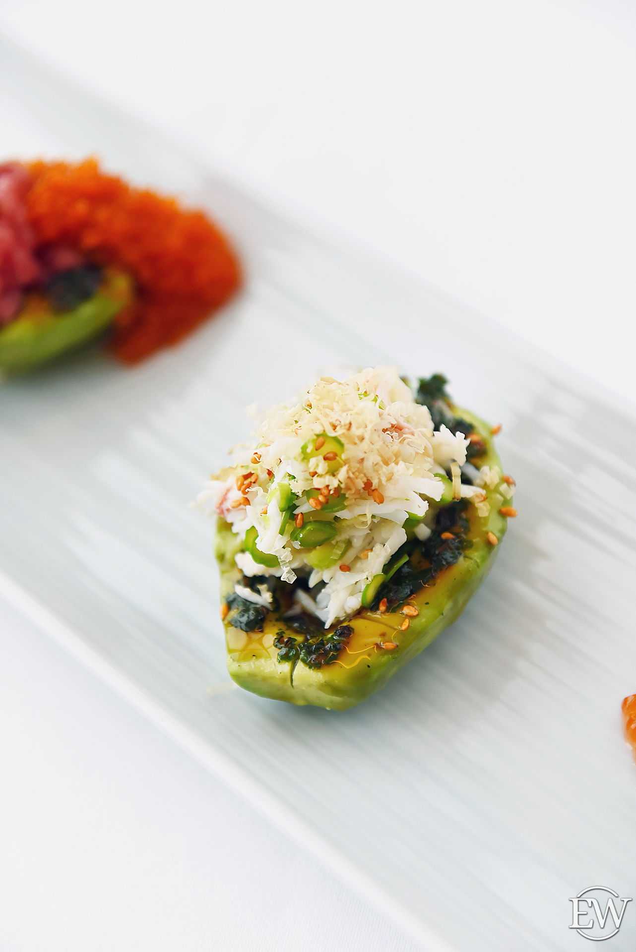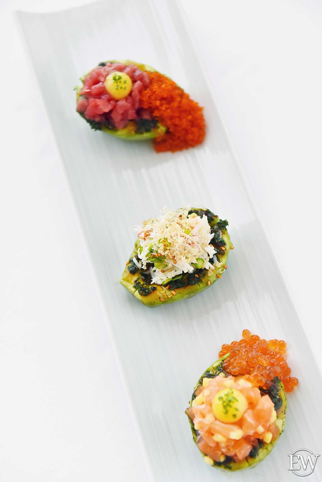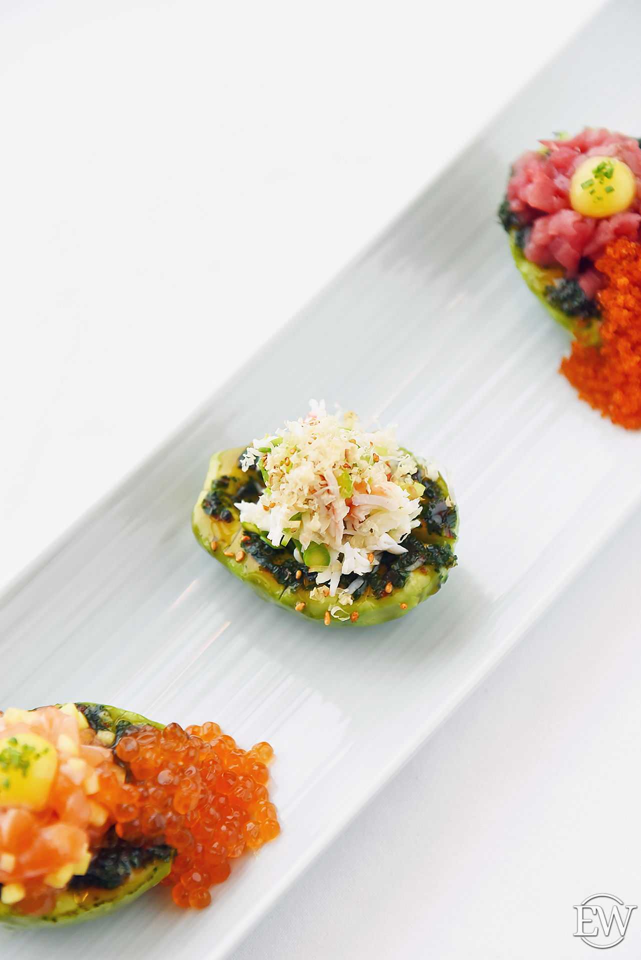 Ассорти японских тартаров: камчатский краб, тунец блюфин, лосось (2700 р.) — здесь главную роль играет подача – на половинках авокадо, что делает вкус более насыщенным, а особую пикантную нотку придаёт соус чимичурри.