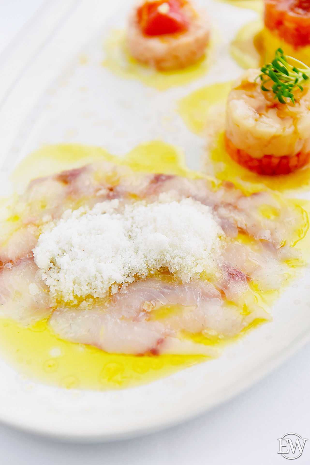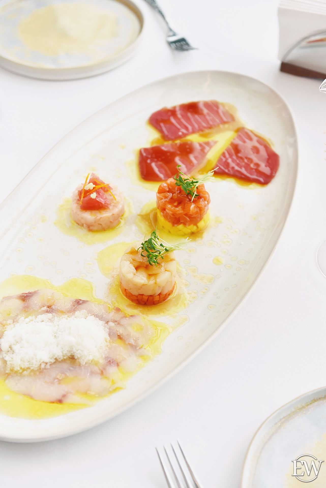 Ассорти карпаччо и тартаров: тунец, сибас, сахалинская креветка, гребешок, лосось (2300 р.) — прекрасное начало трапезы под бокал шампанского, как и отличная возможность попробовать сразу 5 raw-закусок. Нежное мясо тунца, сибас под снегом юдзу, а также изысканные сочетания рыбы с экзотическими фруктами: лосося — с манго, креветки — с грейпфрутом и гребешка — с папайей.