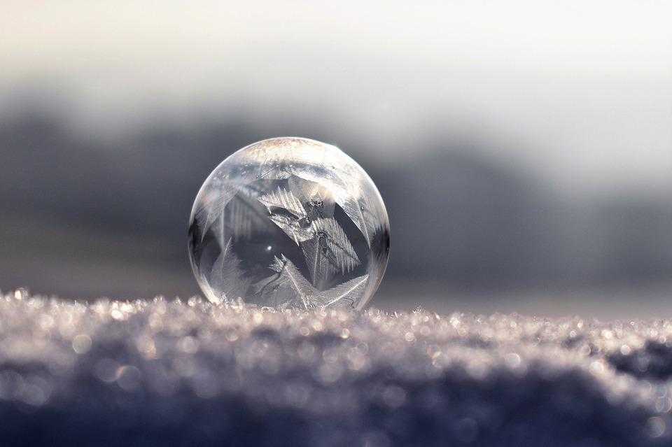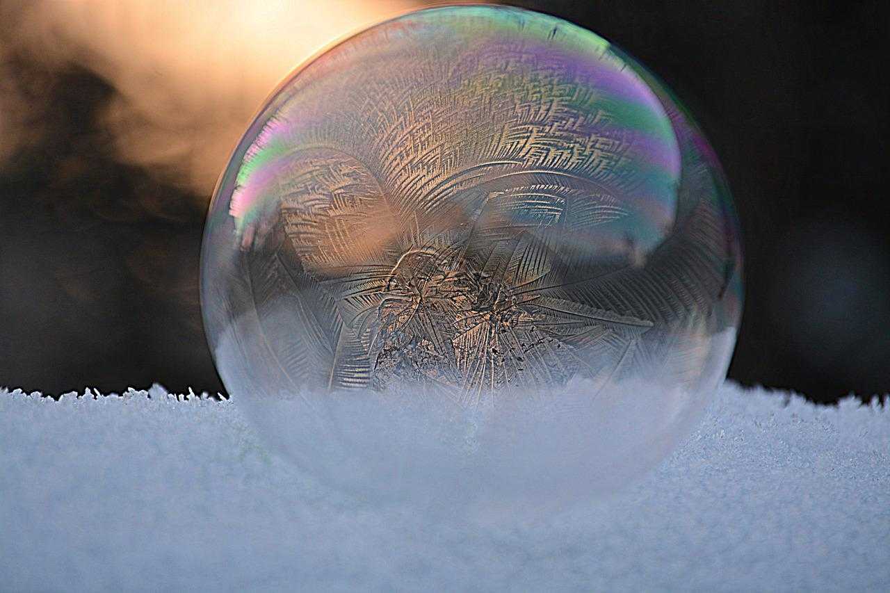 Для осуществления этого приема нужна минусовая погода. Поэтому, это действие замечательно выполнять зимой. Выходим на улицу в мороз и начинаем дуть пузыри. Одновременно с появлением пузыря на нем будут образовываться кристаллы, которые мгновенно разрастутся и покроют всю поверхность пузыря.