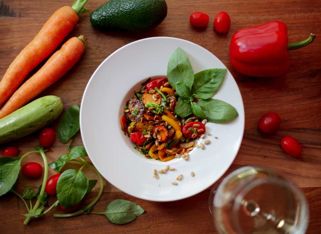 Можно подавать любые рыбные и овощные закуски, салаты. Запеченные и жареные овощи также подходят, как гарнир к основному меню и как самостоятельные блюда.