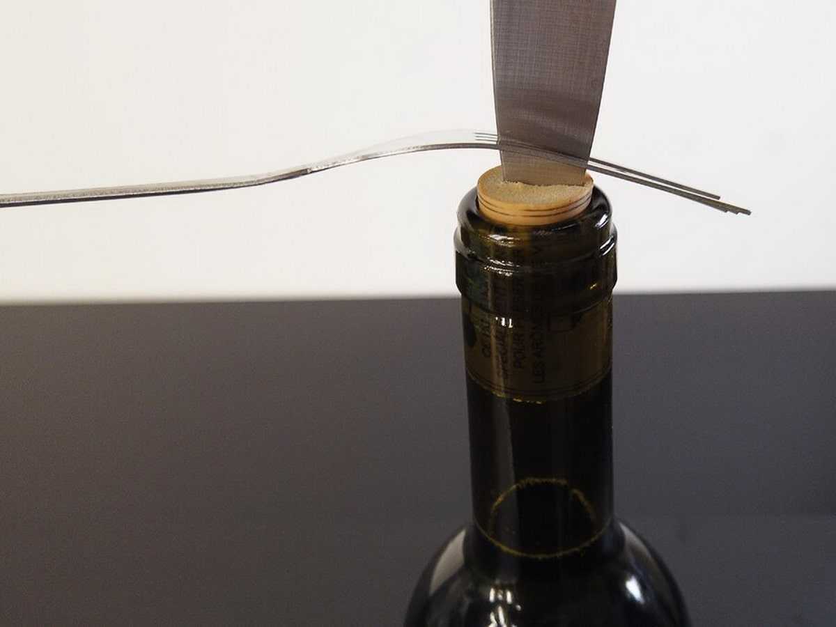Также можно соорудить конструкцию из ножа и вилки, с помощью которой будет проще освободить горлышко. Для этого нож втыкают в пробку, а его лезвие перпендикулярно придерживают зубьями вилки. Придерживая приборы, нож выкручивают, параллельно вытягивая заглушку.